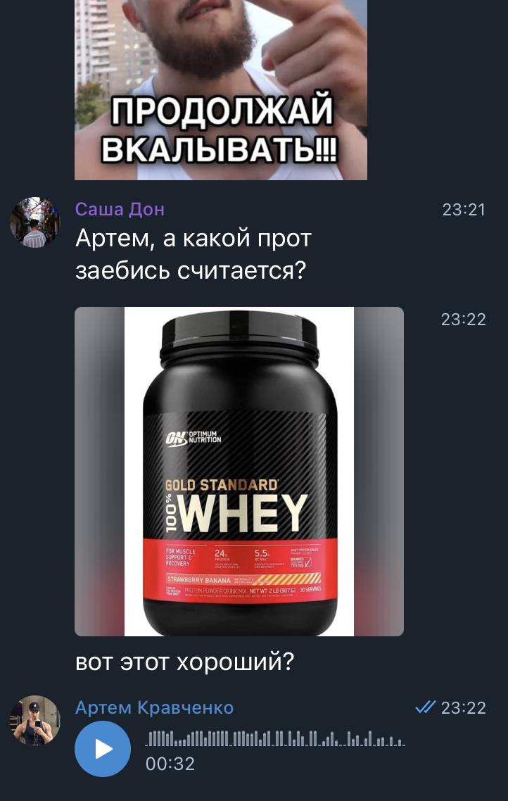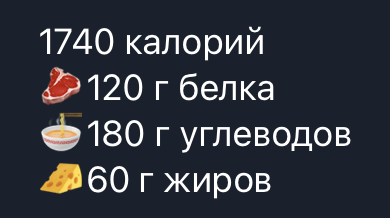 В течение 5 дней я отправлю вам файл с расчётом калорий и правильным соотношением белков, жиров и углеводов под вашу фитнес цель